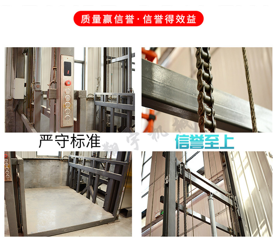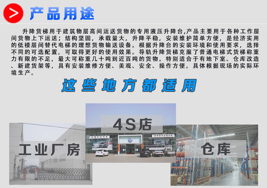 導(dǎo)軌式升降貨梯用于建筑物層高間運(yùn)送貨物的專用液壓升降臺(tái)產(chǎn)品主要用各種工作層間貨物上下運(yùn)送;立體車(chē)庫(kù)和地下車(chē)庫(kù)層高間汽車(chē)舉升等。產(chǎn)品液壓系統(tǒng)設(shè)置防墜、超載安全保護(hù)裝置,各樓層和升降臺(tái)工作臺(tái)面均可設(shè)置操作按鈕,升降貨梯,實(shí)現(xiàn)多點(diǎn)控制。 產(chǎn)品結(jié)構(gòu)堅(jiān)固,承載量大,升降平穩(wěn),安裝維護(hù)簡(jiǎn)單方便,是經(jīng)濟(jì)實(shí)用的低樓層間替代電梯的理想貨物輸送設(shè)備。根據(jù)升降臺(tái)的安裝環(huán)境和使用要求,選擇不同的可選配置,可取得好的使用效果。導(dǎo)軌升降貨梯克服了普通電梯式貨梯稱重力有限的不足,導(dǎo)軌式升降貨梯,可稱重幾十噸到近百噸的貨物。維護(hù)簡(jiǎn)單方便,安裝較普通貨梯也方便。升降貨梯是一種多功能起重裝卸機(jī)械設(shè)備。